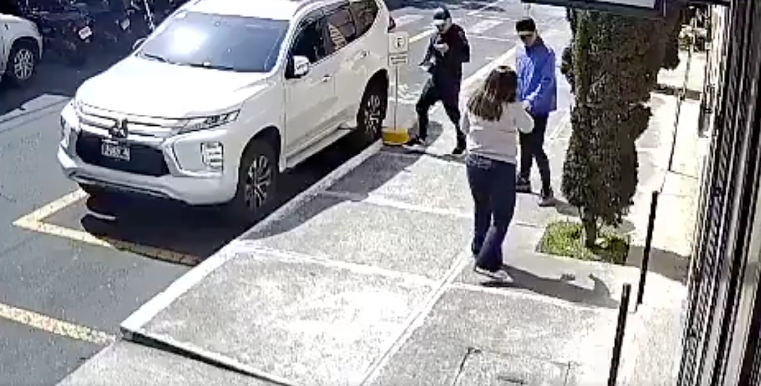 Uno de los sujetos portaba un arma de fuego, lo que generó una escena de tensión. La mujer retrocedió hacia su camioneta intentando evitar el robo, mientras pedía que le abrieran la puerta del inmueble para ponerse a salvo.